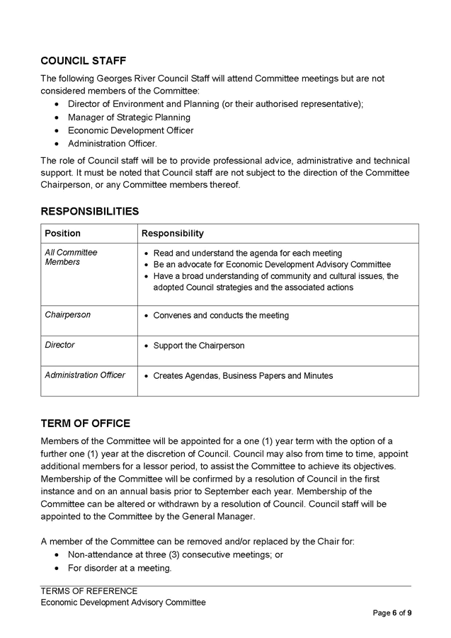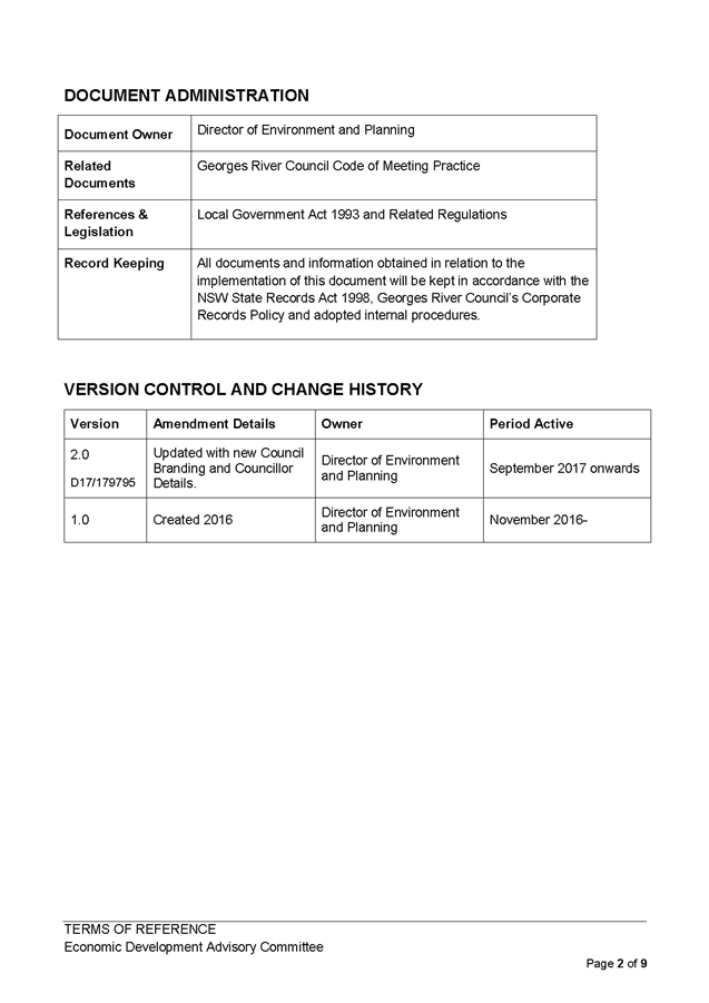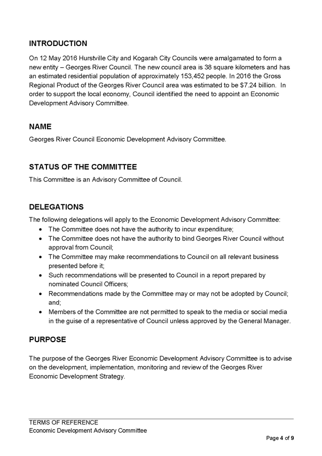 Georges River Council - Environment and Planning Standing Committee Meeting - Monday, 13 November 2017 ENV006-17 Economic Development Advisory Committee Expression of Interest for Members and Terms of Reference [Appendix 1] Updated Terms of Reference Economic Development Advisory Committee |