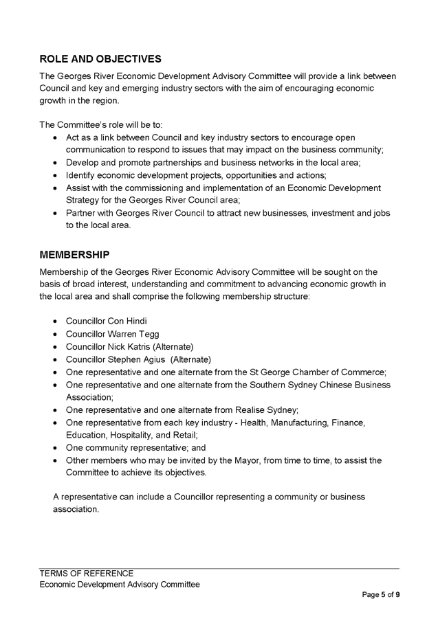 13. The Terms of Reference require that the membership of the Georges River Economic Advisory Committee will be sought on the basis of broad interest, understanding and commitment to advancing economic growth in the local area and shall comprise the following membership structure: