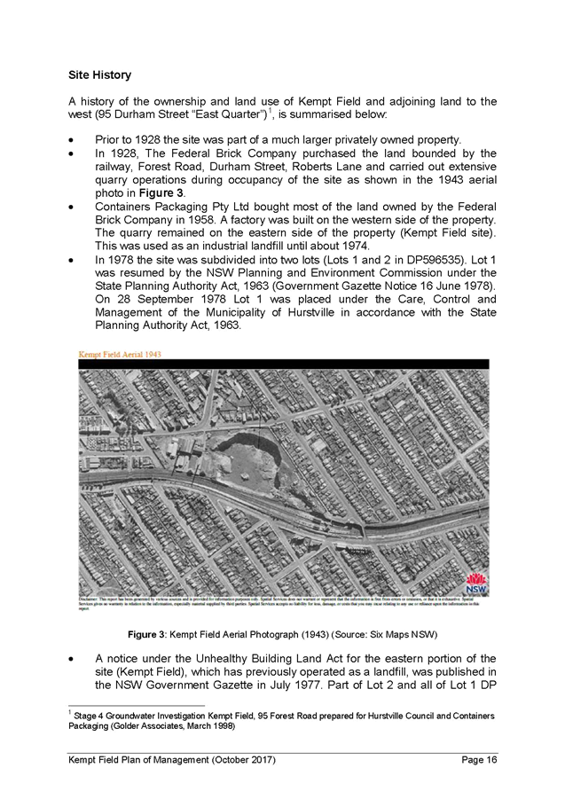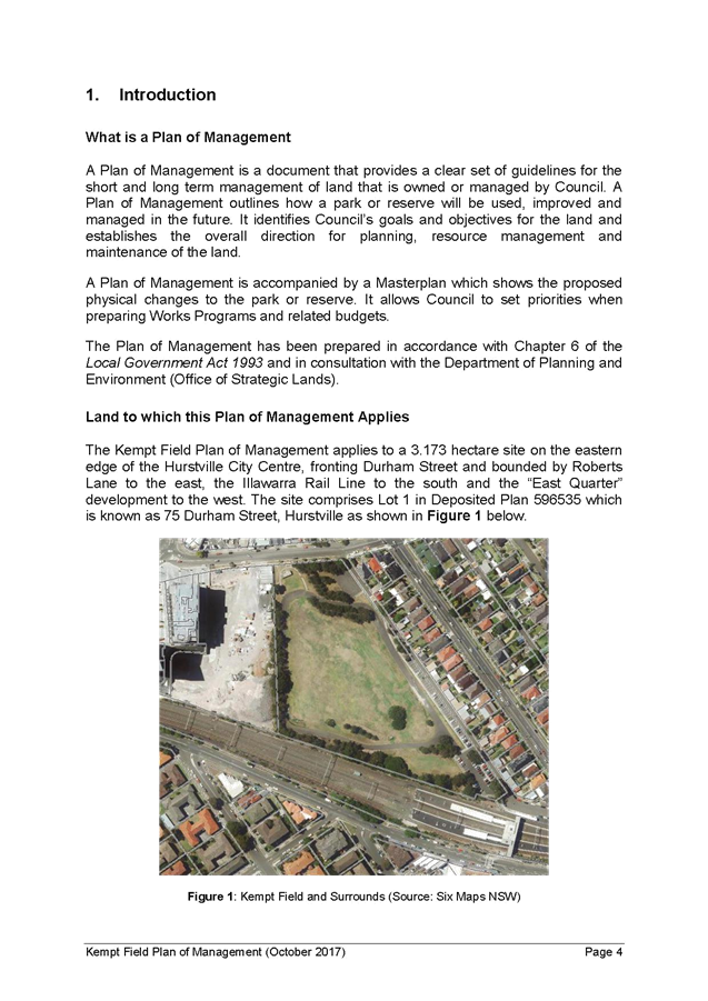 1. Council endorsed the draft Kempt Field Plan of Management and Masterplan for public exhibition at its meeting of 5 June 2017. Approval from the landowner, NSW Department of Planning and Environment (Office of Strategic Lands), to publicly exhibit the draft Plans was provided on 13 July 2017 and the public exhibition of was subsequently undertaken from 26 July to 23 August 2017, with submissions received until 6 September 2017 in accordance with the Local Government Act 1993.