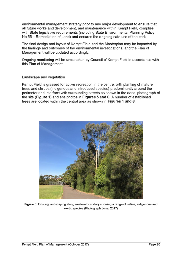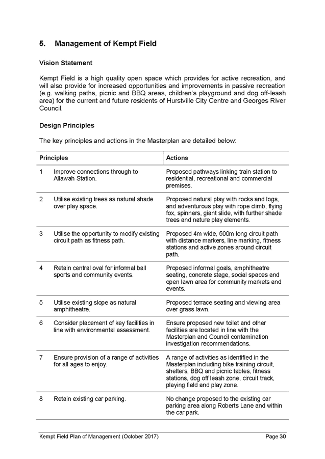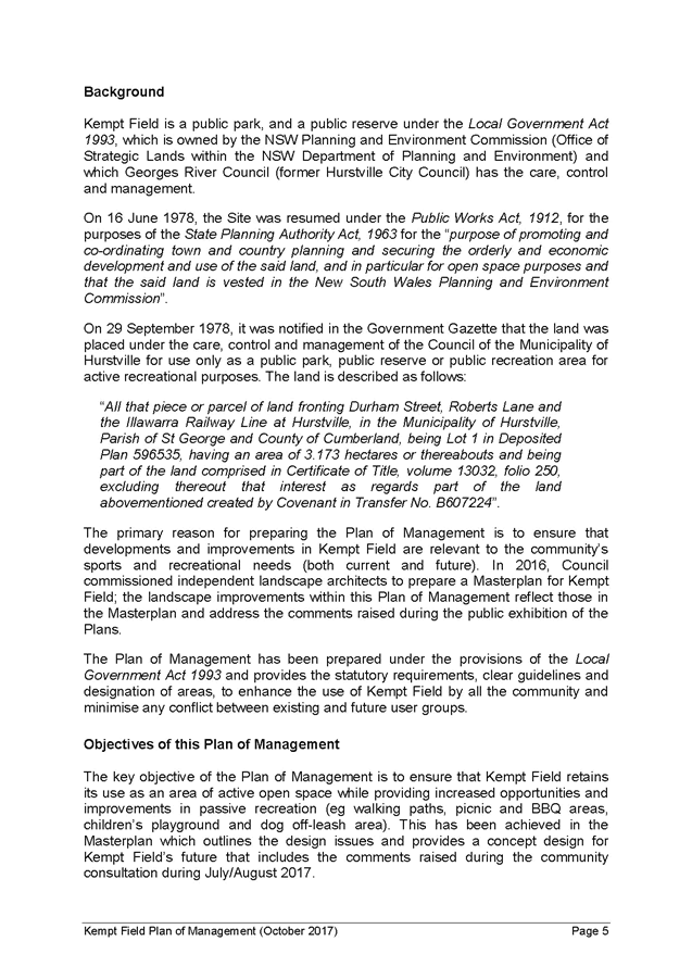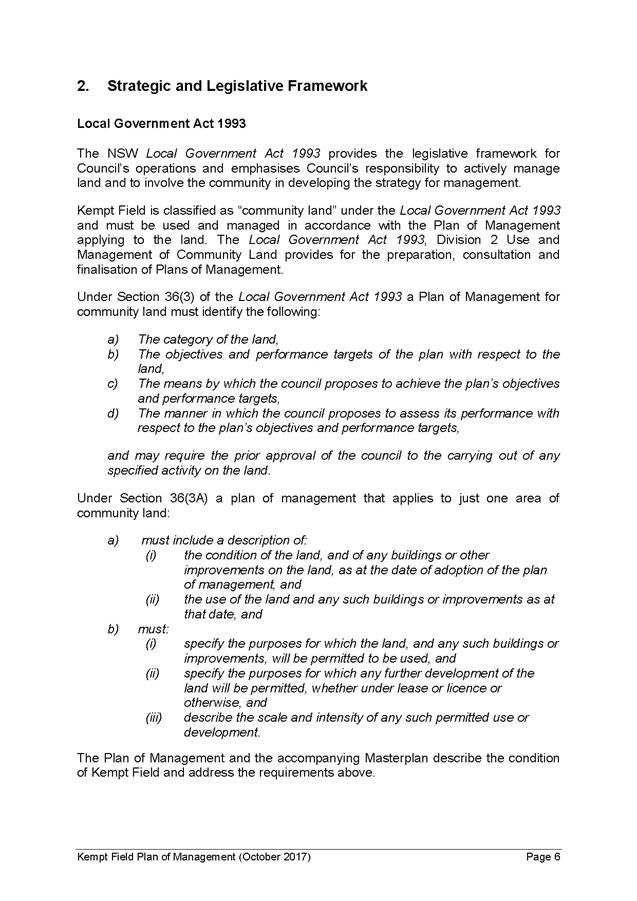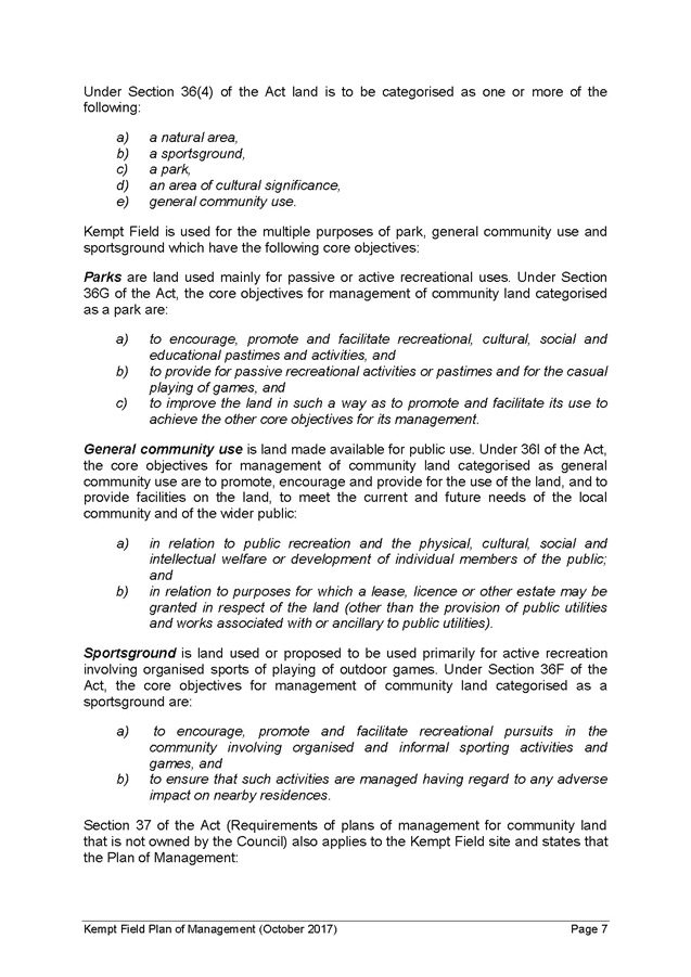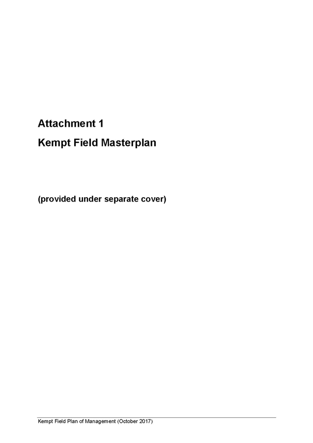 5. The report recommends that the Kempt Field Plan of Management (October 2017) and Masterplan (October 2017) be adopted and finalised in accordance with the requirements of the Local Government Act 1993.