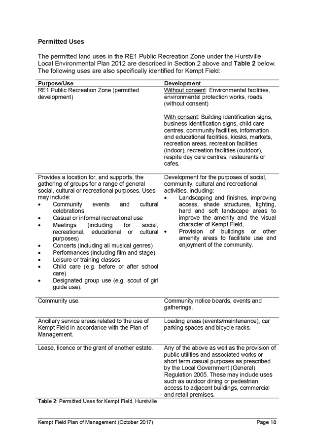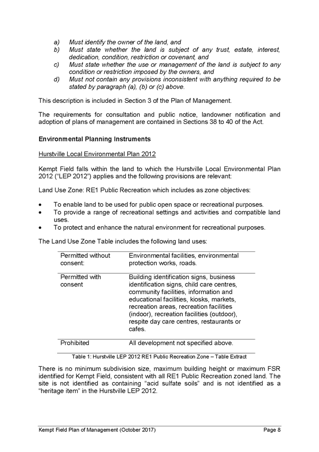 8. The draft Kempt Field Plan of Management and draft Masterplan were placed on public exhibition from 26 July to 23 August 2017, with submissions received until 6 September 2017 and in accordance with the requirements of the Local Government Act 1993.