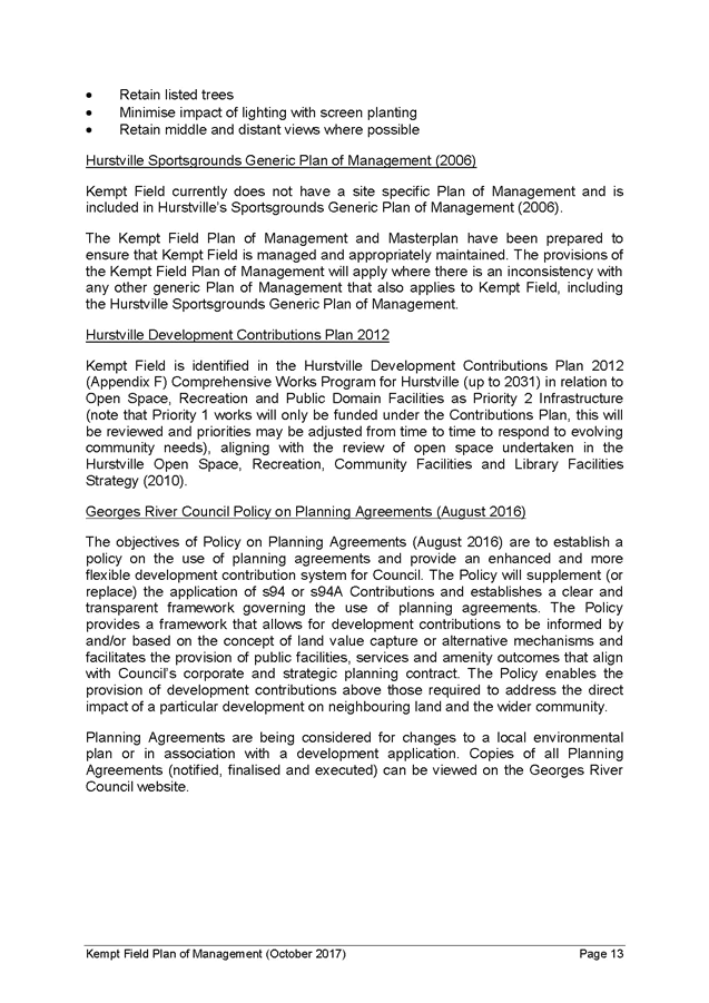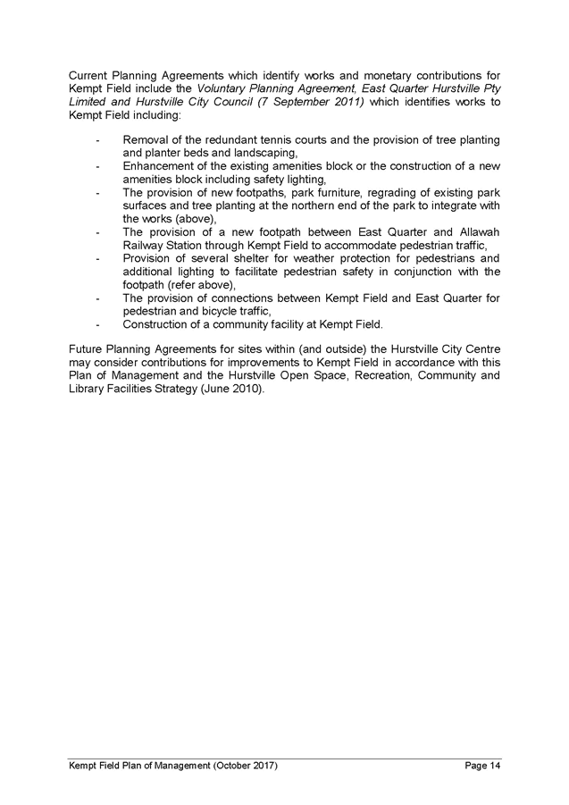 20. Future planning agreements for sites within the Hurstville City Centre may consider contributions for improvements to Kempt Field in accordance with the Kempt Field Plan of Management and the Hurstville Open Space, Recreation, Community and Library Facilities Strategy (June 2010) and in accordance with the Georges River Planning Agreements Policy (August 2016).