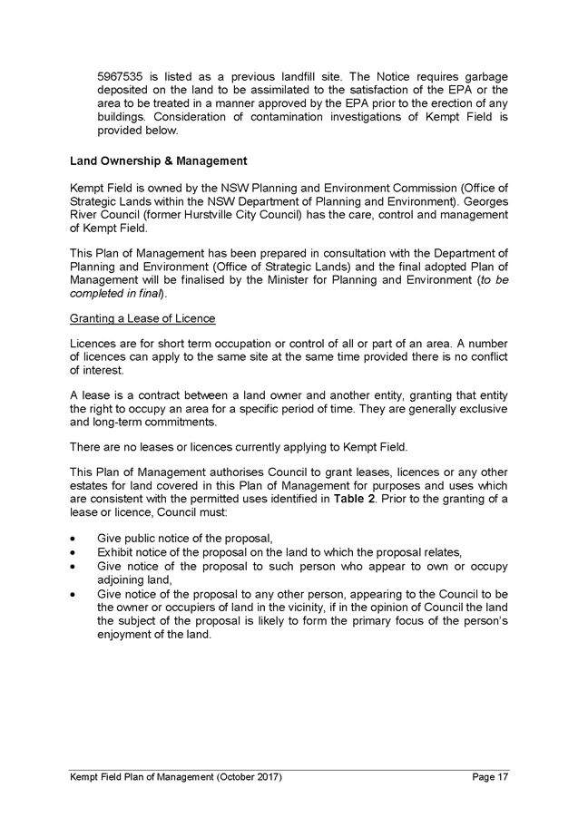 7. The landowner, Department of Planning and Environment (Office of Strategic Lands) was consulted prior to the public exhibition of the draft Kempt Field Plan of Management and Masterplan and raised no objection to the public exhibition. A summary of the submissions received during the public exhibition was provided to the Office of Strategic Lands after the close of the consultation period on 12 September 2017. The Department of Planning and Environment has advised by email dated 18 October 2017 that it has reviewed the submissions made and has no comment to make.