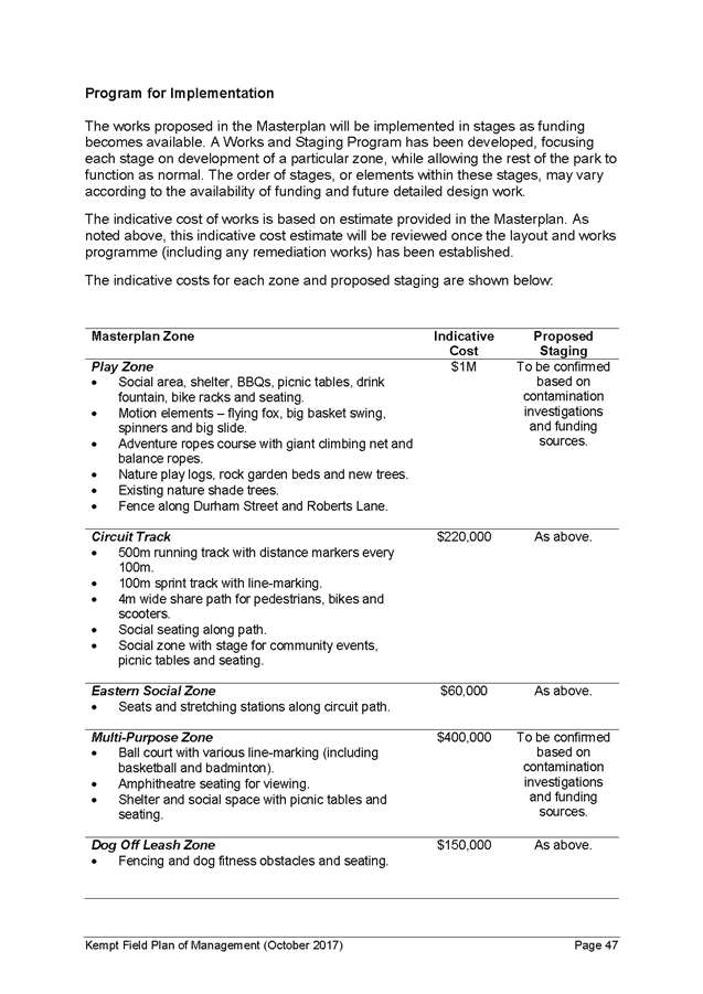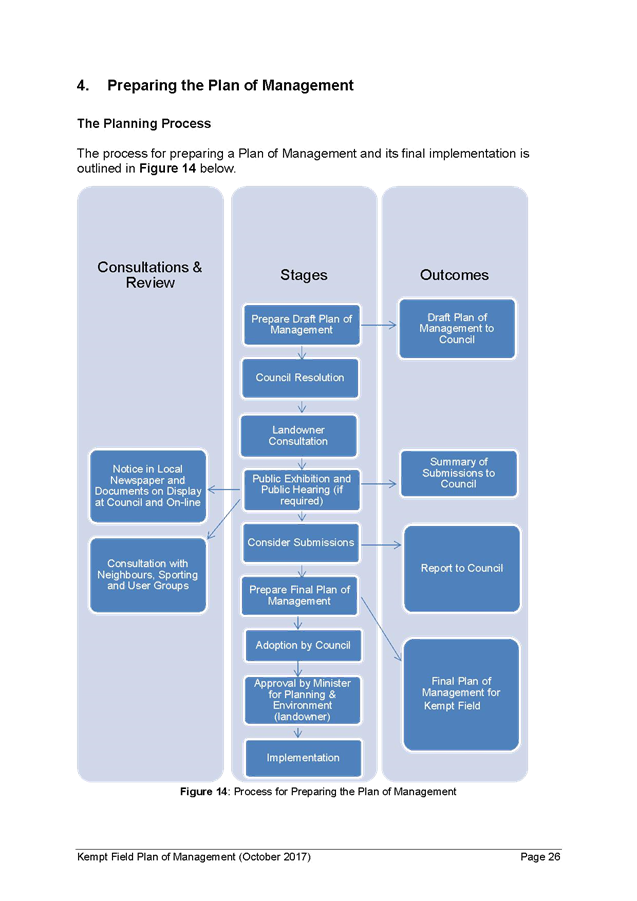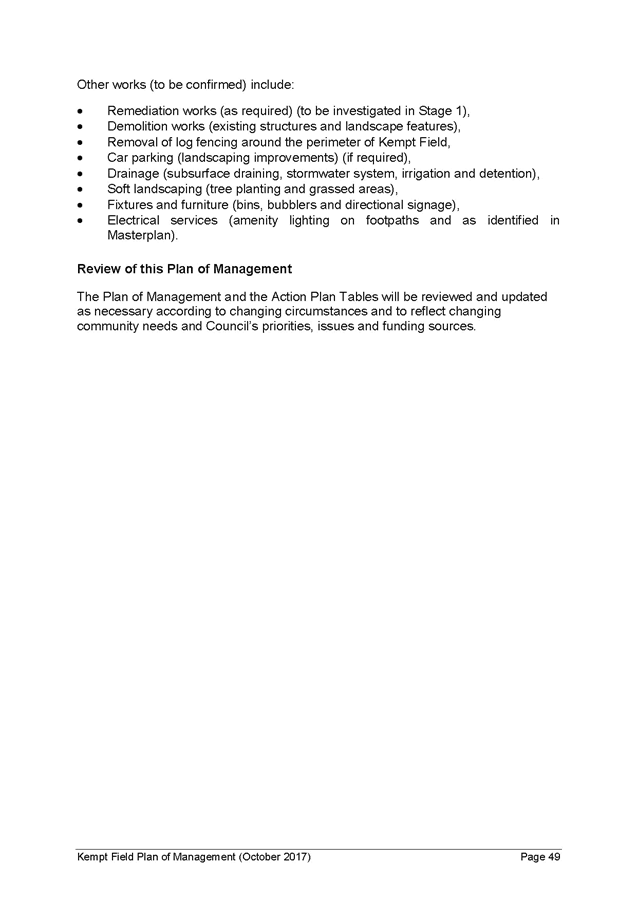 24. If Council resolves to adopt the Kempt Field Plan of Management (October 2017) and Masterplan (October 2017), the following steps will be required to finalise the Plans: