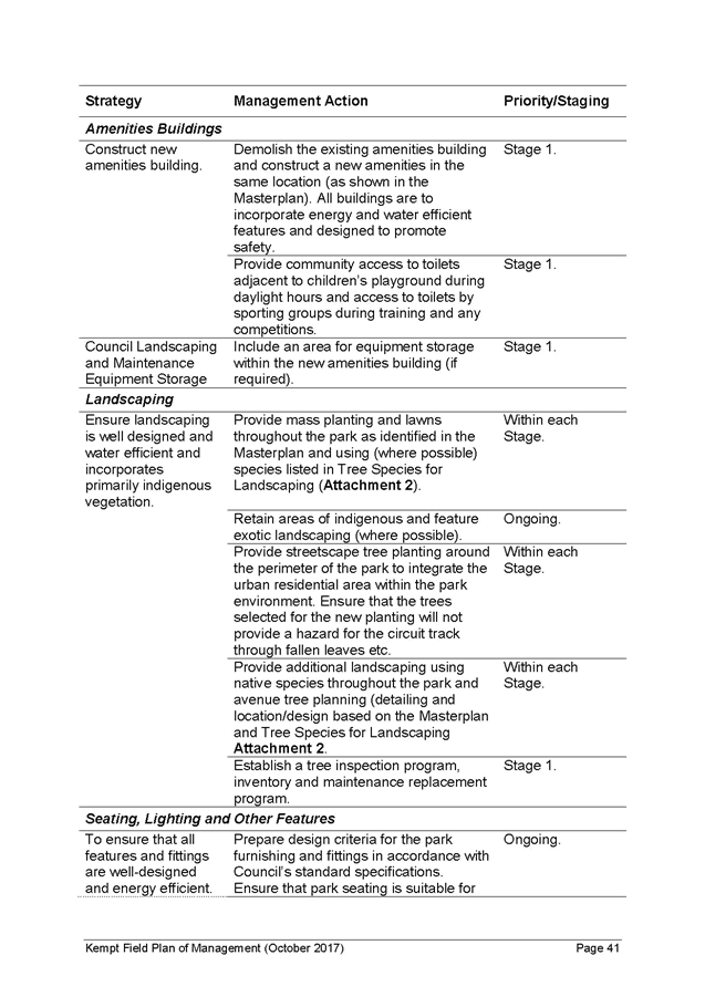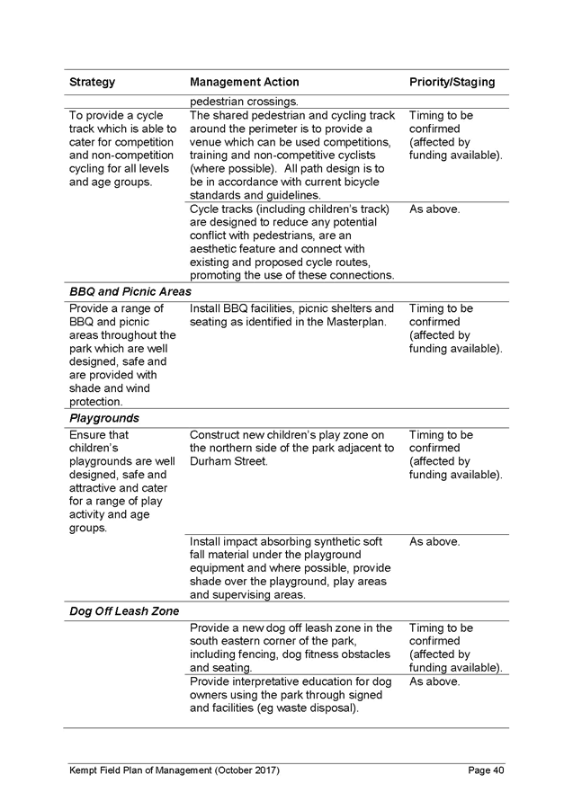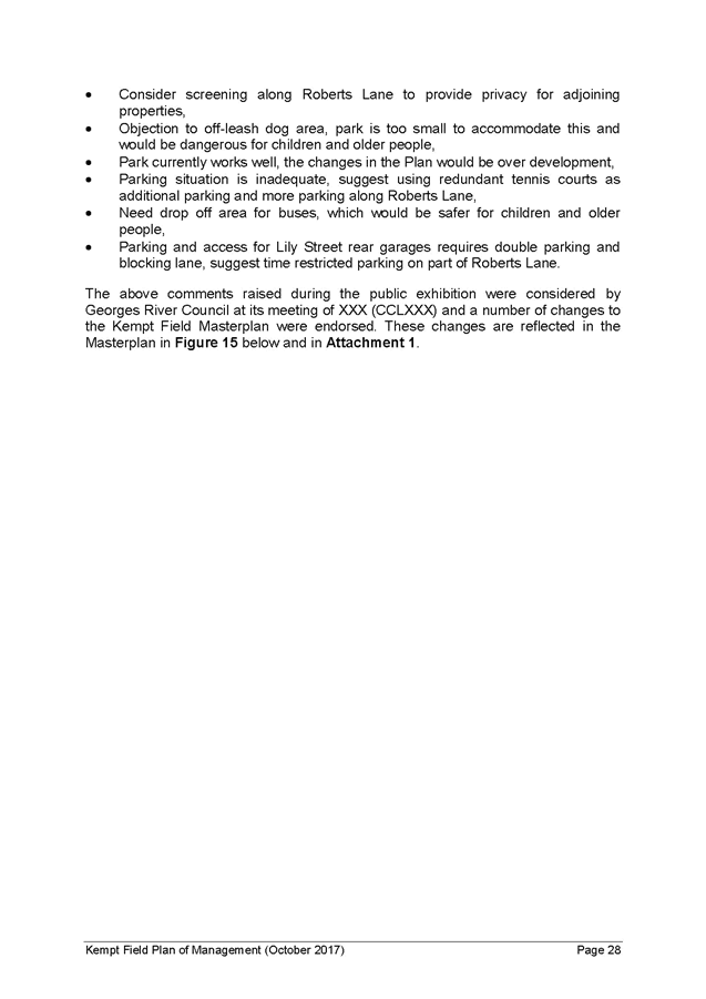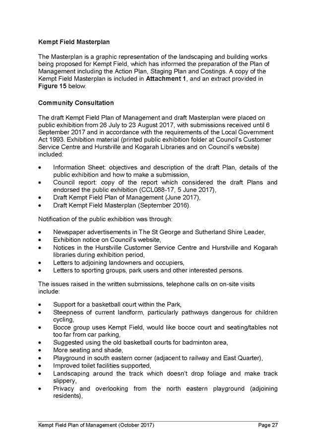 14. A number of changes have been made to the Kempt Field Plan of Management and Masterplan to address the comments raised in submissions and the internal comments. The Kempt Field Plan of Management (October 2017) and revised Masterplan (October 2017) include the following changes from the exhibited versions and describe the community consultation and address the comments made in submissions: