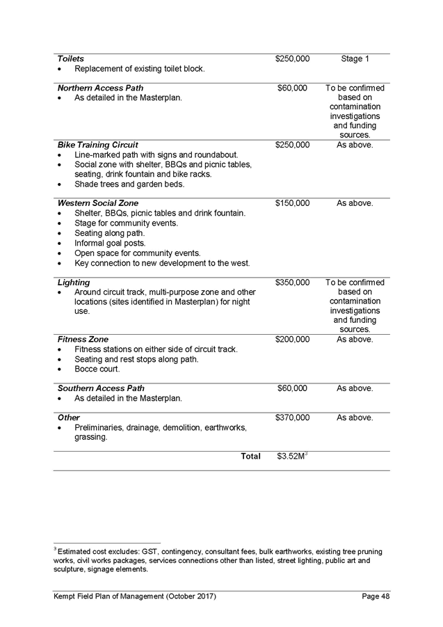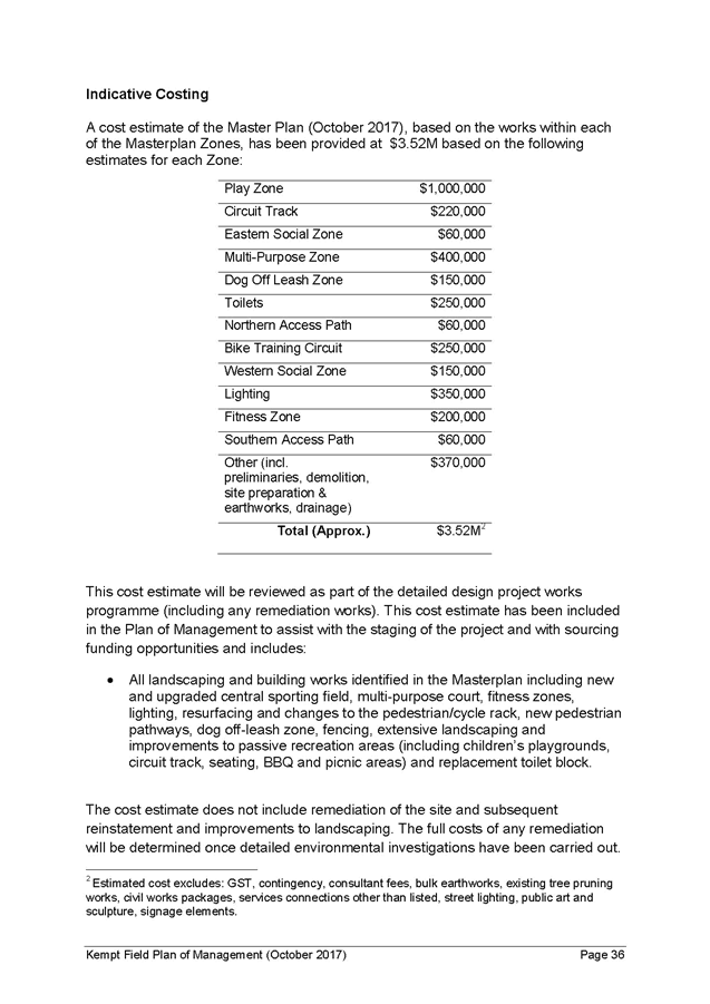 16. A cost estimate of $3.52M (based on the revised Masterplan (October 2017)) has been included in the Plan of Management. This cost estimate will be reviewed as part of the detailed design project works programme (including any remediation works) has been finalised. This cost estimate has been included in the Plan of Management to assist with the staging of the project and with sourcing funding opportunities and includes: