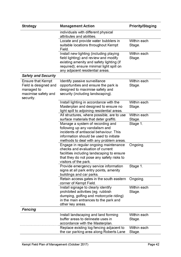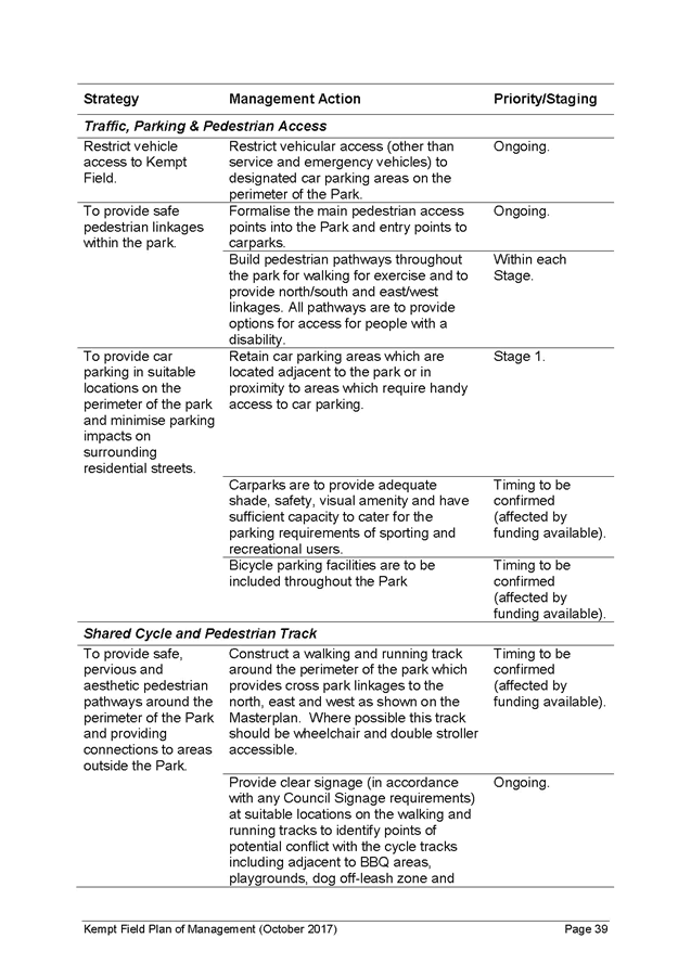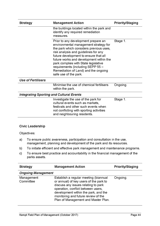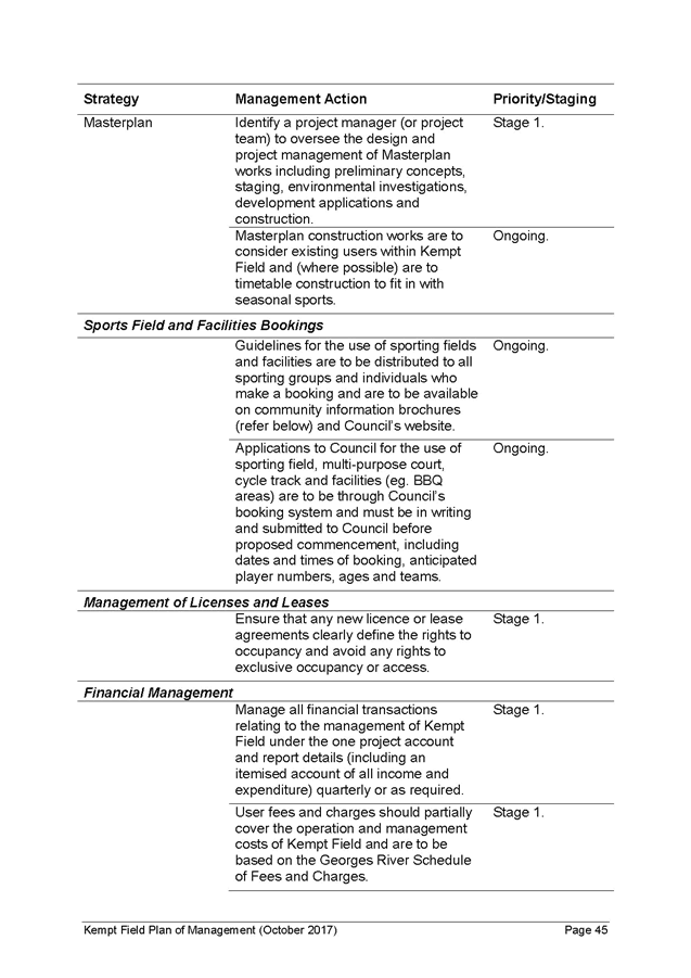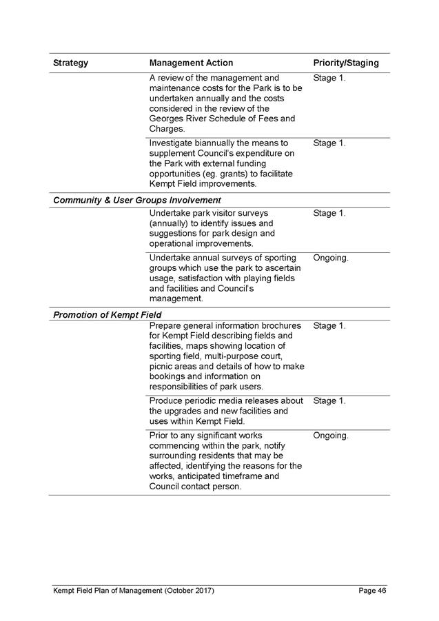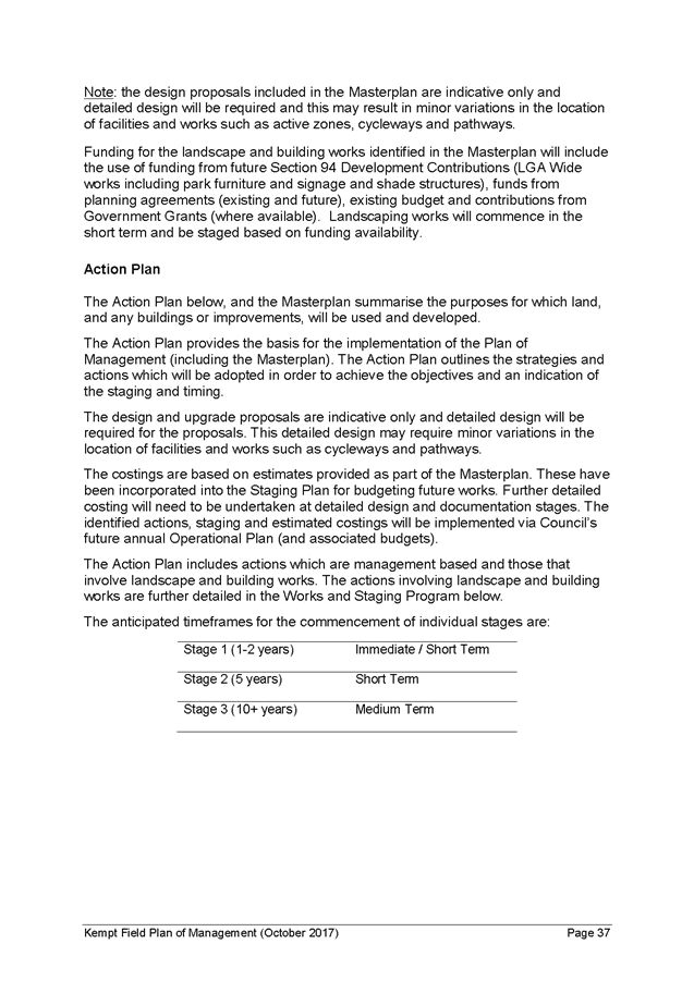 19. Funding may also be available from fees paid for community events and any leases or licences on the site for use permitted in Kempt Field, for example coffee carts, outdoor dining or markets (refer Table of Permitted Uses in the Plan of Management). The staging of landscaping works identified in the Plan have been estimated based on funding availability (as noted above) and commence in Stage 1 (immediate/short term or 1-2 years) and extend to Stage 2 (short term or 5 years) and Stage 3 (medium term or 10+ years).