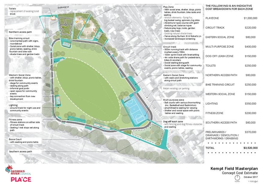 · All landscaping and building works identified in the Masterplan including new and upgraded central sporting field, multi-purpose court, fitness zones, lighting, resurfacing and changes to the pedestrian/cycle rack, new pedestrian pathways, dog off-leash zone, fencing, extensive landscaping and improvements to passive recreation areas (including children’s playgrounds, circuit track, seating, BBQ and picnic areas) and replacement toilet block.