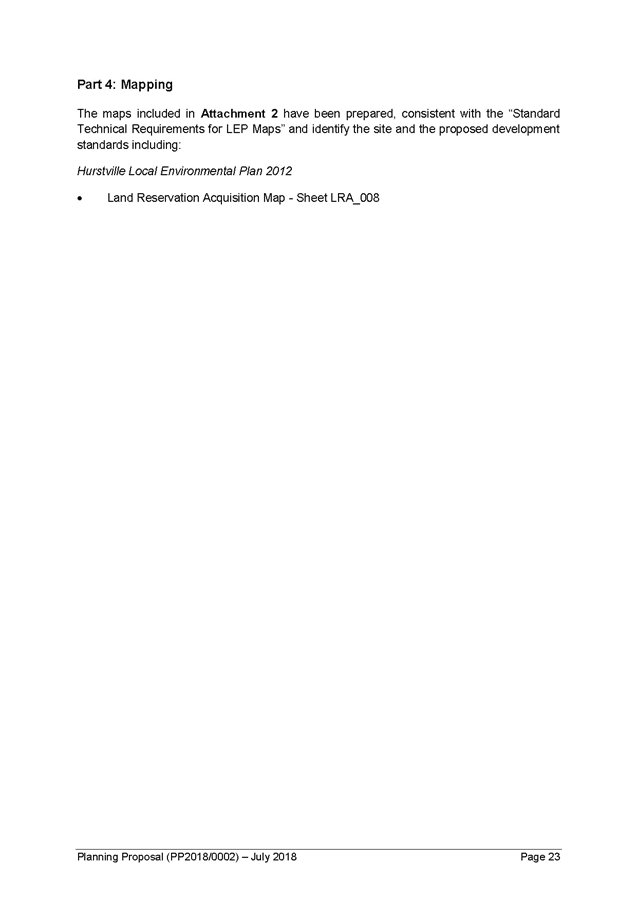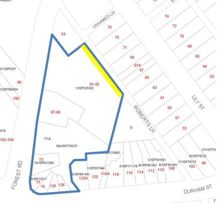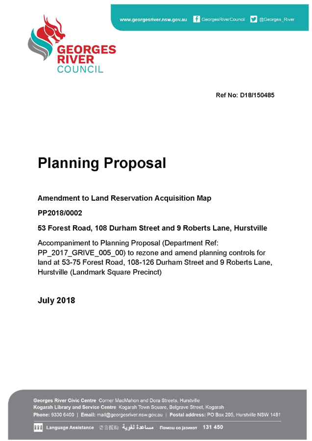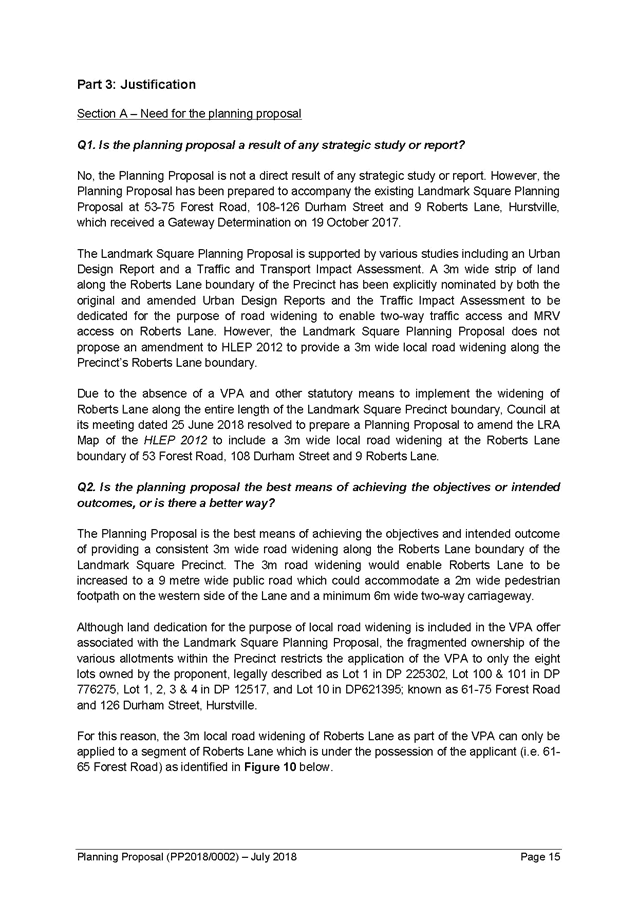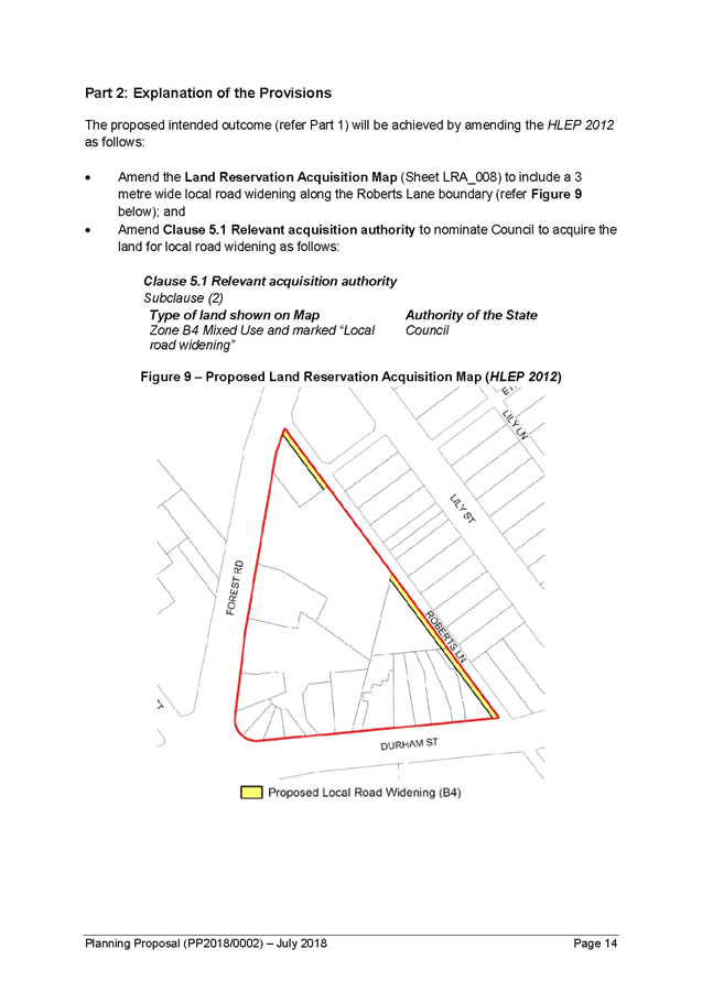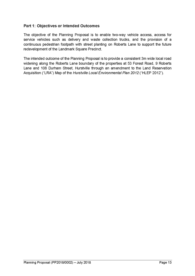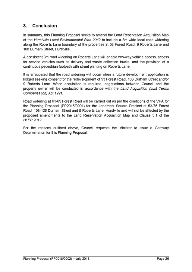 75. In summary, this Planning Proposal seeks to amend the Land Reservation Acquisition Map of the Hurstville Local Environmental Plan 2012 to include a 3m wide local road widening along the Roberts Lane boundary of the properties at 53 Forest Road, 9 Roberts Lane and 108 Durham Street, Hurstville.