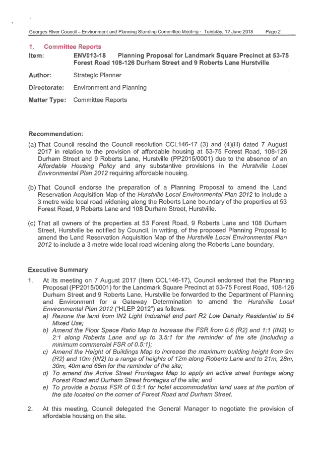Georges River Council - Georges River Local Planning Panel (LPP) - Thursday, 19 July 2018 LPP029-18 53 Forest Road, 9 Roberts Lane and 108 Durham Street, Hurstville [Appendix 1] Report to the Environment and Planning Committee dated 12 June 2018 |