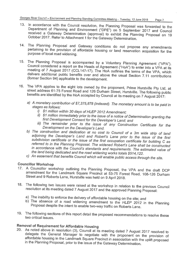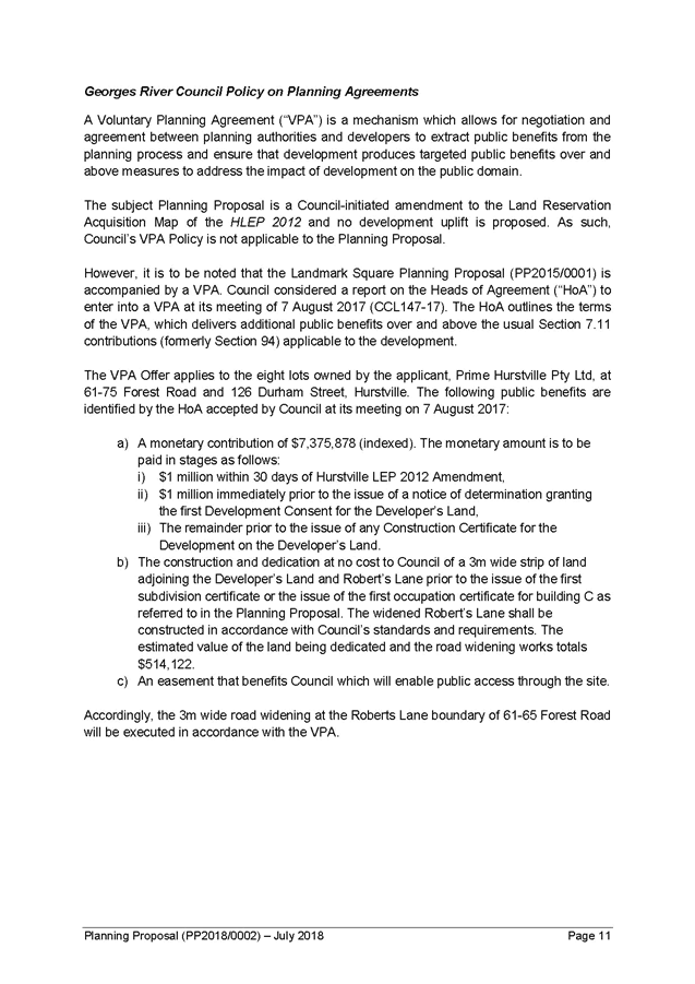 72. However, it is to be noted that the Landmark Square Planning Proposal (PP2015/0001) is accompanied by a VPA. Council considered a report on the Heads of Agreement (“HoA”) to enter into a VPA at its meeting of 7 August 2017 (CCL147-17). The HoA outlines the terms of the VPA, which delivers additional public benefits over and above the usual Section 7.11 contributions (formerly Section 94) applicable to the development.