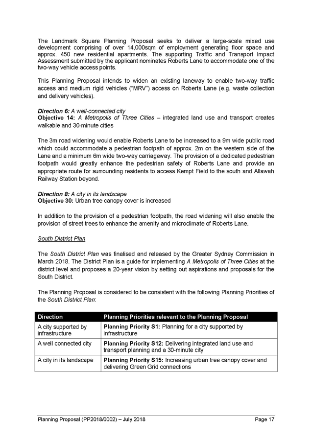 59. The South District Plan was finalised and released by the Greater Sydney Commission in March 2018. The District Plan is a guide for implementing A Metropolis of Three Cities at the district level and proposes a 20-year vision by setting out aspirations and proposals for the South District.