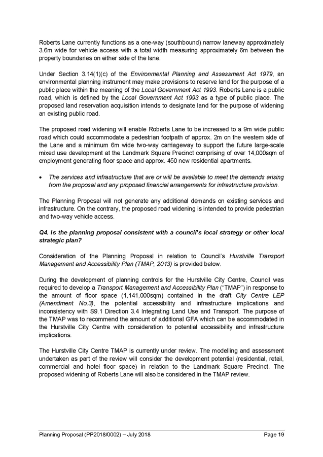 64. The Hurstville City Centre TMAP is currently under review. The modelling and assessment undertaken as part of the review will consider the development potential (residential, retail, commercial and hotel floor space) in relation to the Landmark Square Precinct. The proposed widening of Roberts Lane will also be considered in the TMAP review.