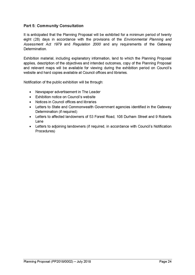 78. If a Gateway Determination (Approval) is issued, and subject to its conditions, it is anticipated that the Planning Proposal will be exhibited for a period of 28 days in accordance with the provisions of the Environmental Planning and Assessment Act 1979 and Regulation 2000 and any requirements of the Gateway Determination.