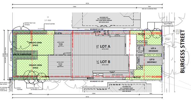 4. The site falls about 1.33m from the north eastern corner of Burgess Street to the rear (western) boundary. There are twelve (12) trees located within the property boundaries, and one (1) tree located on the nature strip.